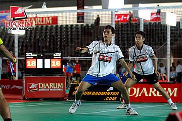 Abu Bakar/Tedi Supriadi (PB Djarum) bersiap mengembalikan shuttlecock ke arah Rajid Patriawan/Rino Ramadhika (Pelatprov DKI Jakarta).