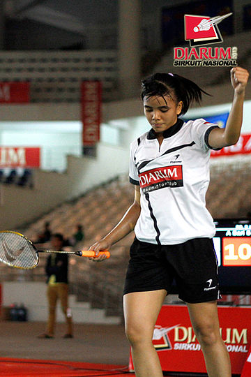 Selebrasi Arinda Sari Sinaga (PB Djarum) setelah berhasil mencuri poin dari Mitzi Abigail (Sarwendah).