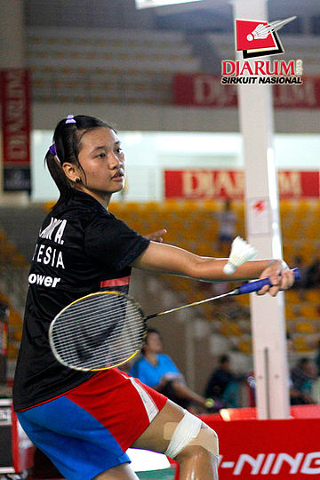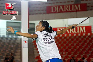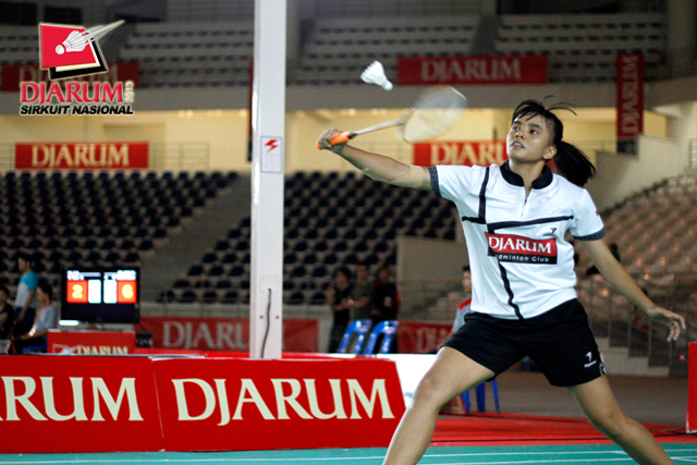 Mitzi Abigail (Sarwendah) gagal mengembalikan shuttlecock ke arah Arinda Sari Sinaga (PB Djarum).
