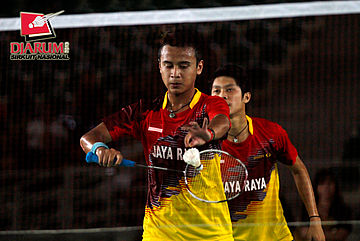 Engga Nur Hanafi/Fachriza Abimanyu (Jaya Raya) bersiap melepaskan serve.