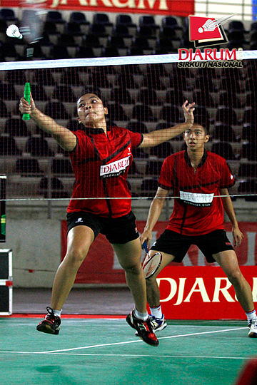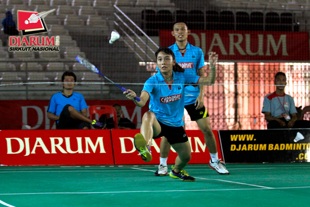 Ricky Alverino/Ristya Ayu (PB Djarum) menyambar pengembalian tanggung dari pasangan Franky Wijaya/Shinta Dwi (Exist).