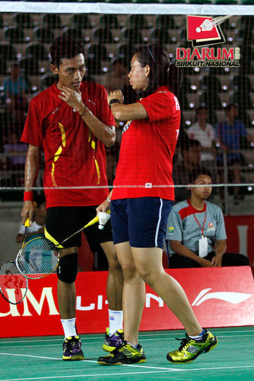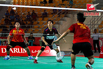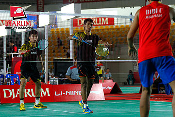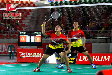 Riyo Arief/Nadya Melati (Hi Qua Wima/Pertamina Indonesia) bersiap menyambut pengembalian dari pasangan Rosyadi/Muzelin (PB Malibu).