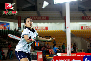 Rena Asela (PB Djarum) bersiap mengembalikan shuttlecock ke arah Vina Anggraini (Tanjung Balai).