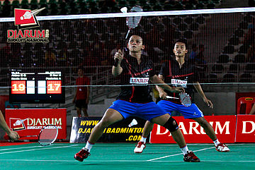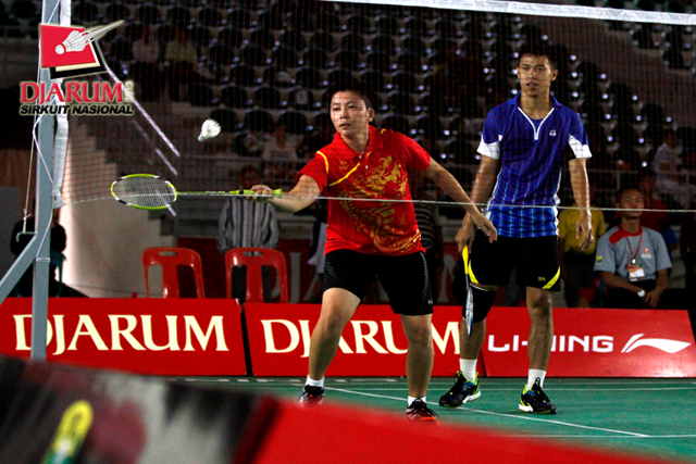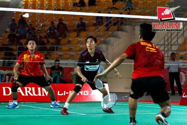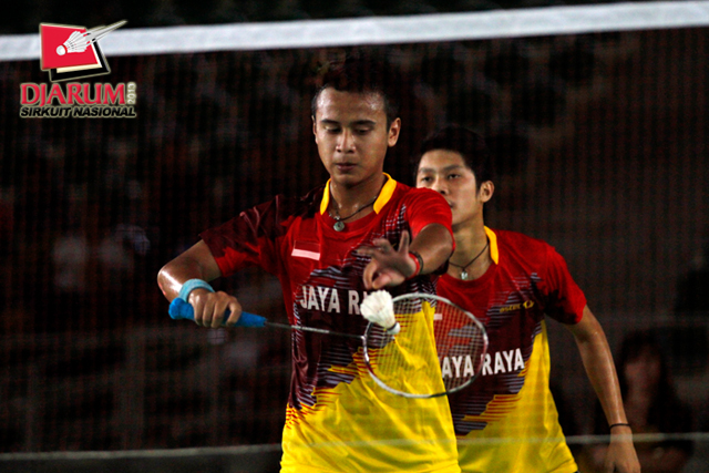 Akbar Bintang/Kevin Ersa (PB Djarum) berhasil menghadang serangan yang dilepaskan pasangan Engga Nur Hanafi/Fachriza Abimanyu (Jaya Raya).