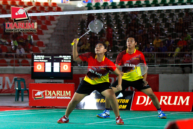Aldo Abdillah/Desaula Gendy (Jaya Raya) bersiap menyambar pengembalian tanggung dari pasangan Marin Mainaky/Dina Rahayu (SGS PLN).