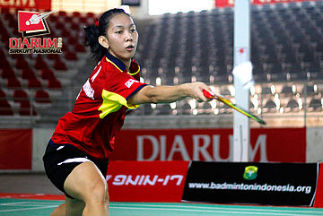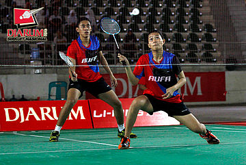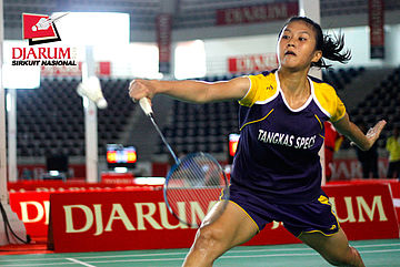 Tieke Arieda (Jaya Raya Suryanaga) mengembalikan shuttlecock ke arah Putri Muthia (Tangkas Specs).