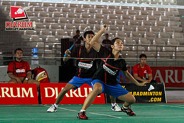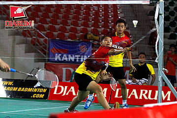 Moehamat Febriansyah/Cynthia Shara (PB Djarum) berusaha menggapai pengembalian dari pasangan Gabriel Sanbouw/Aghisna Fatkhul (Jaya Raya Suryanaga).