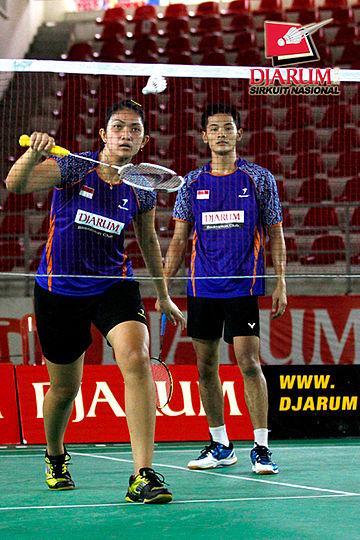 Andika Ramadiansyah/Marsheilla Gisca (PB Djarum) bersiap menyambar pengembalian dari pasangan Aji Firmansyah/Bunga Fitriani (Mutiara Bandung).