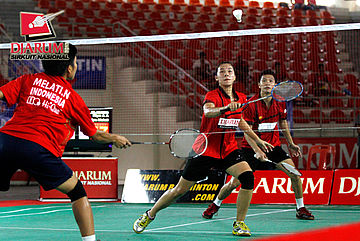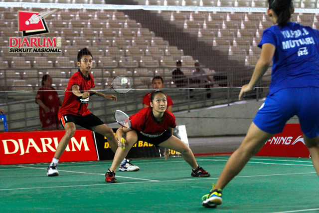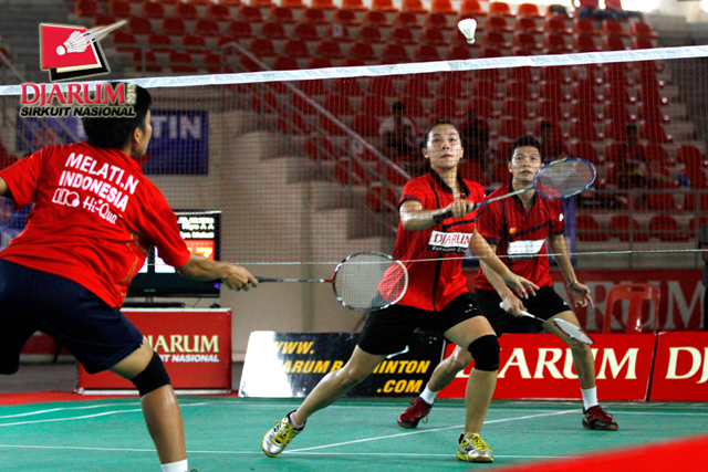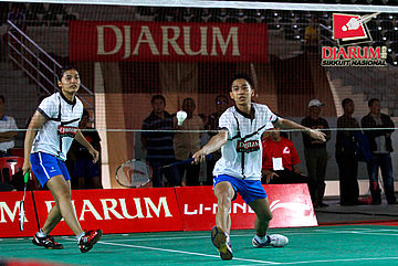 Darmiko/Deariska Putri (PB Djarum) menyambut serve dari Yodhi Satrio/Ni Ketut Mahadewi (Jaya Raya Suryanaga).