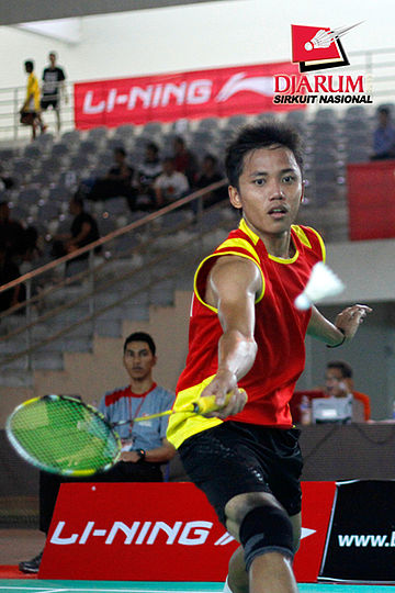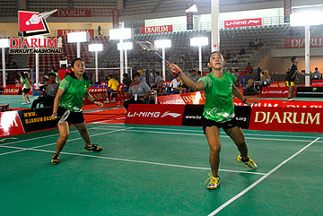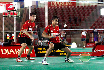 Fauzi Adnan (Jaya Raya Suryanaga) mengembalikan shuttlecock ke arah Hermansyah (Jaya Raya).
