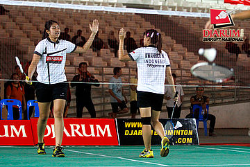 Selebrasi Deariska Putri/Nurbeta Kwanrico (PB Djarum) saat berhasil mencuri poin dari pasangan Dian Fitriani/Nadya Melati (Jaya Raya/Pertamina Indonesia).