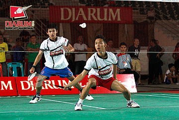 Alwi Mahardika/Felix Eka (Exist) menyambar serve dari pasangan Hantoro/Ricky Alverino (PB Djarum).
