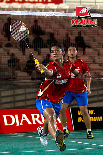 Cynthia Shara/Ramadhani Hastiyanti (PB Djarum) menyambar pengembalian tanggung dari Bunga Fitriani/Mayrina Lukmanda (Mutiara Bandung).