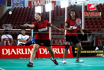 Chintia Rhizta/Ristya Ayu (PB Djarum) mengembalikan shuttlecock ke arah Afni Fadilah/Putri Sekartaji (Indocafe Medan/Mutiara Bandung).