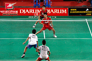 Dicky Cahya/Rifky Nur Alam (PB Djarum) bersiap mengembalikan shuttlecock ke arah pasangan Jerico See/Rinov Rivaldy (PB Djarum).