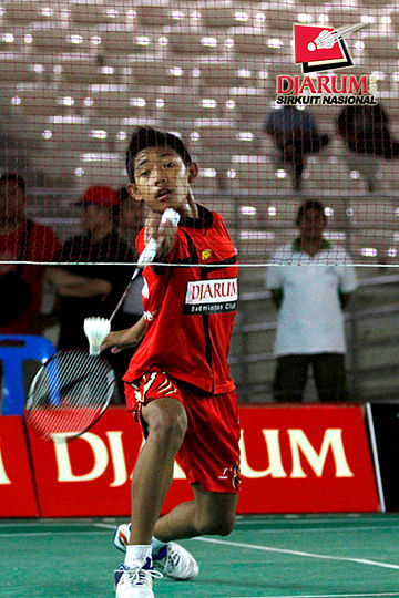 Bagas Kristianto (PB Djarum) mengembalikan shuttlecock ke arah Langgeng Prakoso (PB Djarum).