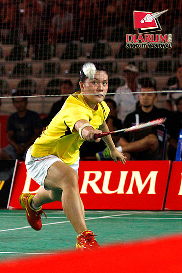 Ardiansyah Putra/Devi Tika Permatasari (Pertamina Indonesia/SGS PLN) menyambar pengembalian tanggung dari pasangan Yodhi Satria/Ni Ketut Mahadewi (Jaya Raya Suryanaga).
