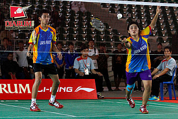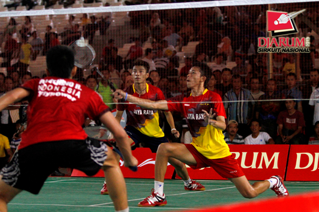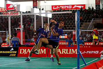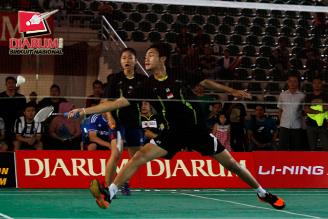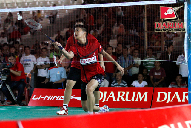 Clinton Hendrik/M. Rian Ardianto (Jaya Raya) mengembalikan shuttlecock ke arah Hantoro/Ricky Alverino (PB Djarum).