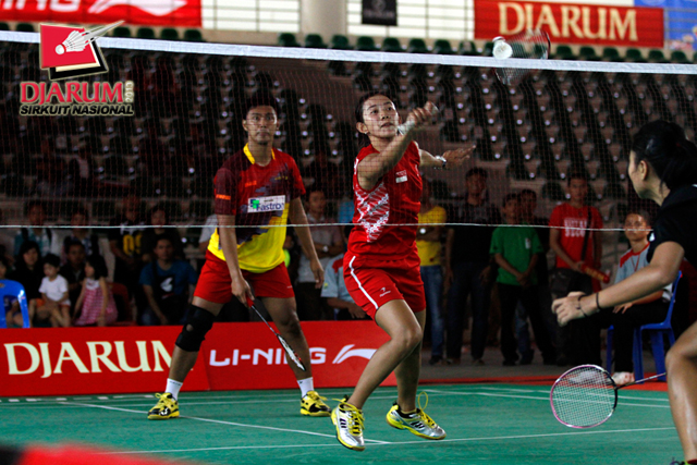 Andika Ramadiansyah/Marsheilla Gisca (PB Djarum) bersiap mengembalikan shuttlecock ke arah pasangan Andre Suryo/Yulfira Barkah (Mutiara Bandung).