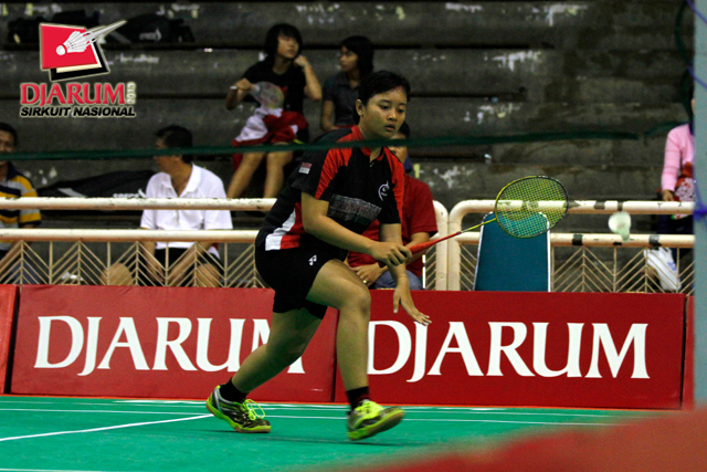 Sandra Rahayu (Sarwenda) mengembalikan shuttlecock ke arah Maharani Ayu (Hi Qua Wijaya).