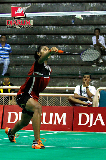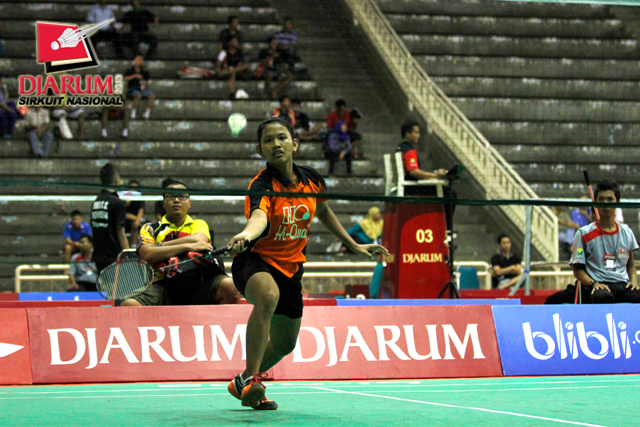 Maharani Ayu (Hi Qua Wijaya) bersiap mengembalikan shuttlecock ke arah Sandra Rahayu (Sarwenda).
