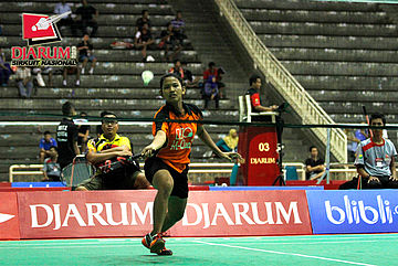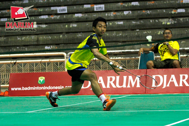Antoro Pujo (Pendowo) mengembalikan shuttlecock ke arah Febrizky Yafi (Jaya Raya).