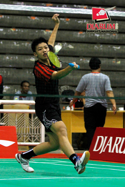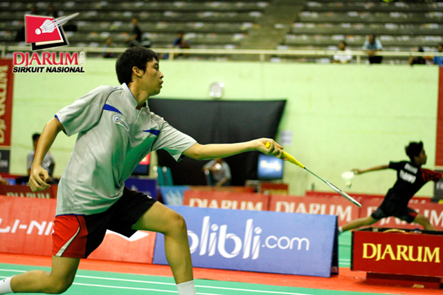 Taufan Fadli (Candra Wijaya) mengembalikan shuttlecock ke arah Ridwan Arista (Pertamina Indonesia).