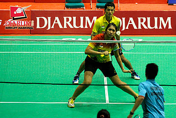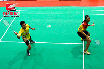 Darmiko/Deariska Putri (PB Djarum) bersiap menyambut pengembalian dari Bagus Haryanto/Nuansa Giva (Mutiara Bandung).