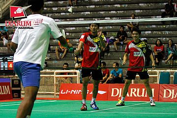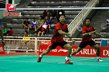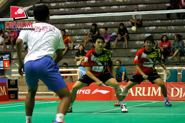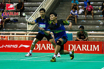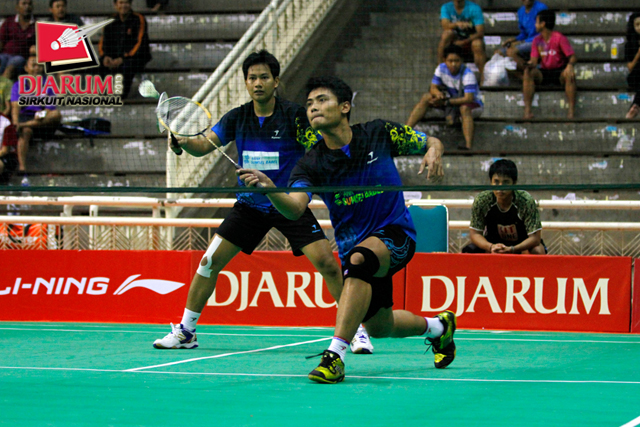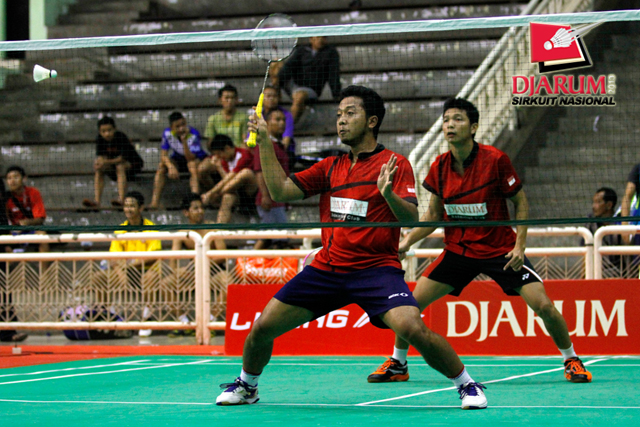 Achmad Rivai/Subhan Hasan (Bank Sumsel) mengembalikan shuttlecock ke arah Rahmat Adianto/Seiko Wahyu (PB Djarum).