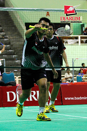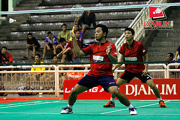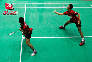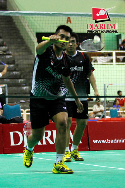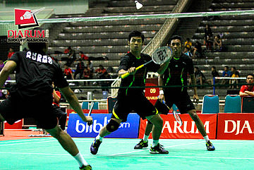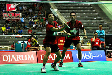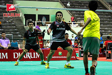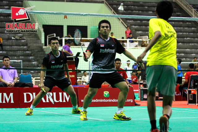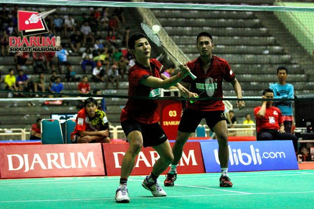 Hafiz Faizal/Putra Eka (Pelatnas) menyambut serve dari pasangan Hendri Saputra/M. Azis (Bintang Perkasa).
