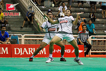 Rahmat Adianto/Seiko Wahyu (PB Djarum) mengembalikan shuttlecock ke arah Rendra Wijaya/Rian Sukmawan (Musica Champion).