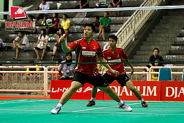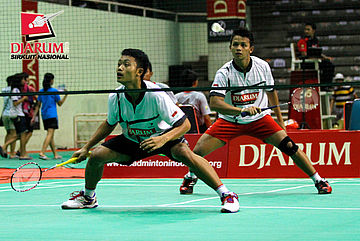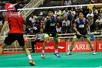 Kenas Adi/Rangga Yave (PB Djarum) berusaha menghadang pengembalian dari Riyo Arif/Rizky Hidayat (Hi Qua Wima).