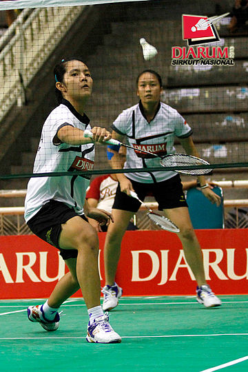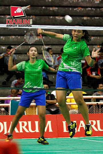 Chintia Rhizta/Ristya Ayu (PB Djarum) mengembalikan shuttlecock ke arah Linda Mutiara/Sinta Arum (Mutiara Bandung).