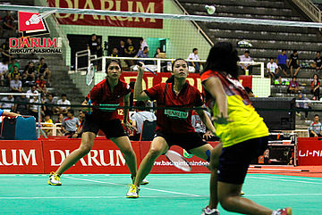 Deariska Putri/Nurbeta Kwanrico (PB Djarum) mengembalikan shuttlecock ke arah Aris Budiharti/Ery Oktaviani (Jaya Raya).
