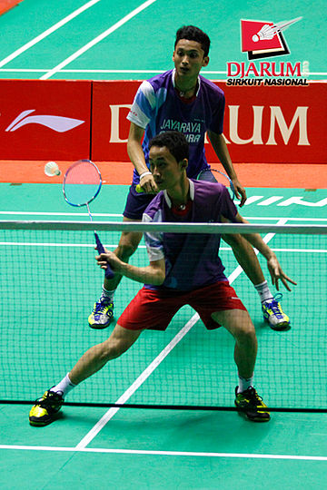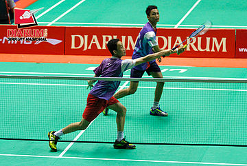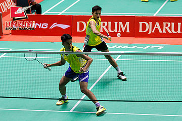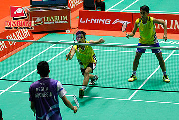 Henry Jansen/Aulia Rahma (PB Djarum) bersiap menyambar pengembalian dari Yusuf Yudayanto/Liony Citra (Bintang Utama).
