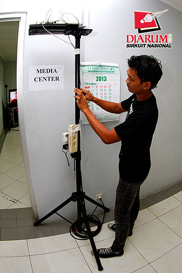 Seorang pekerja sedang memasang jaringan internet untuk kebutuhan media center.