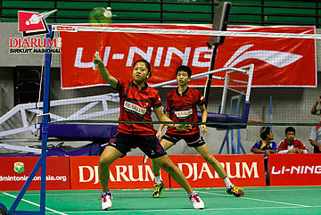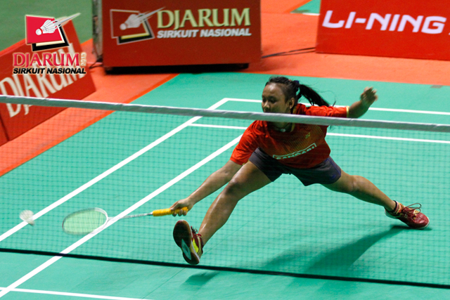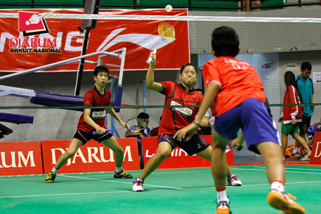 Henry Jansen/Aulia Rahma (PB Djarum) mengembalikan shuttlecock ke arah pasangan Yusuf Yudayanto/Liony Citra (Bintang Utama).