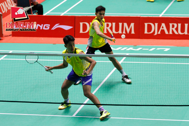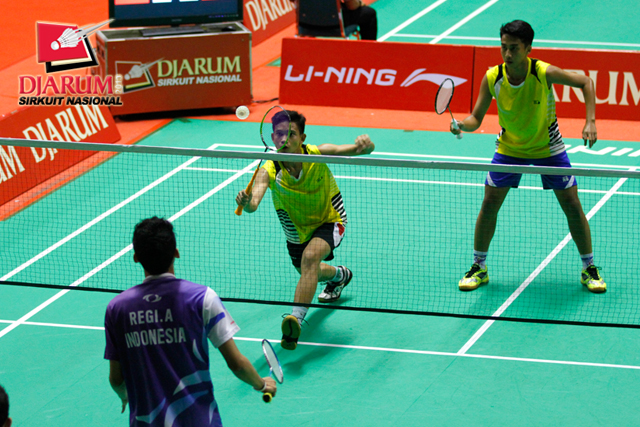 Muhammad Irfan/Regi Athallah (Jaya Raya Az Zikra) mengembalikan shuttlecock ke arah Darmawanzha/Irfan Arief (Hi Qua Wima).