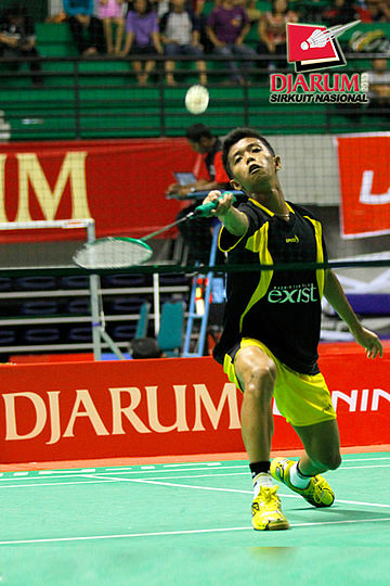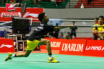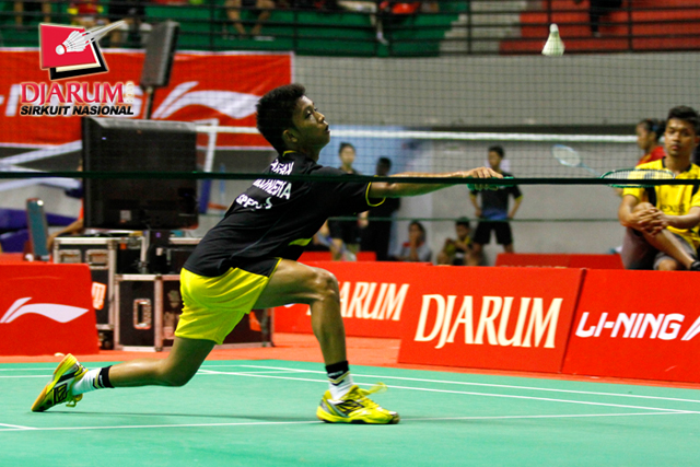 Arfan Zainal (Exist) mengembalikan shuttlecock ke arah M. Zico (PPLP DKI Jakarta).