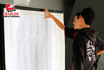 Dua atlet sedang melihat hasil kualifikasi Djarum Sirkuit Nasional Li-Ning Yogyakarta Open 2013 di depan pintu masuk GOR Among Raga.