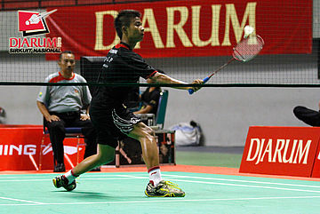 Kurniawan (PPLP Jateng) mengembalikan shuttlecock ke arah Yudha (Hero Bali).