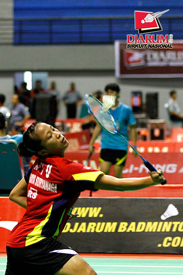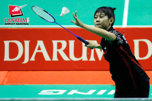Khristin Thonia (Pendowo) gagal mengembalikan shuttlecock ke arah Liony Citra (Bintang Utama).
