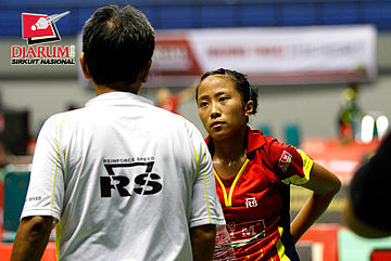 Ayu Febbyastri (Jaya Raya Suryanaga) saat mendapatkan pengarahan dari pelatihnya di sela-sela jeda set pertama