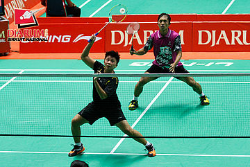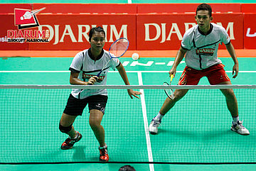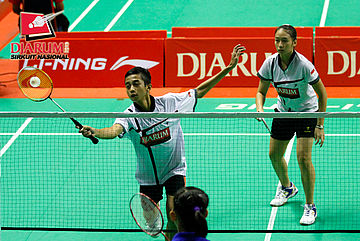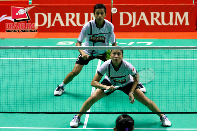 M. Febriansyah/Cynthia Shara (PB Djarum) bersiap menyambut pengembalian dari Aji Firmansyah/Bunga Fitriani (Mutiara Bandung).