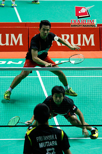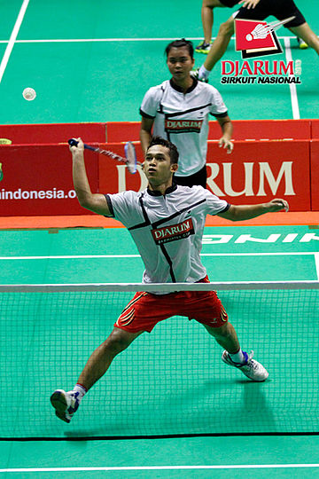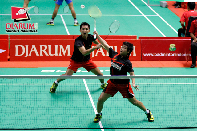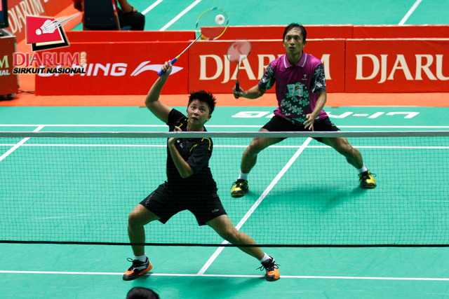Jeka Wiratama/Chintia Rhizta (PB Djarum) bersiap menyambar pnegembalian tanggung dari Richard Kuncoro/Meirisa Cindy (Jaya Raya Suryanaga).
