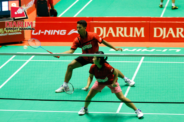 M. Febriansyah/Cynthia Shara (PB Djarum) menghadang pengembalian dari Aji Firmansyah/Bunga Fitriani (Mutiara Bandung).