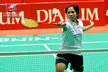 Rusydina Antardayu (Tangkas Specs) berusaha menggapai pengembalian dari Tike Arieda (Jaya Raya Suryanaga).