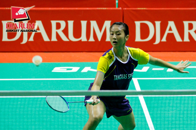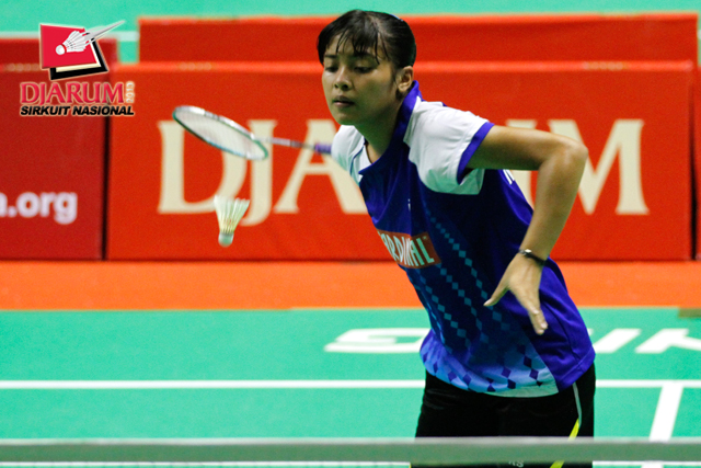 Mayrina Lukmanda (Mutiara Bandung) berhasil menghadang serangan bertubi-tubi yang dilepaskan Gregoria Mariska (Mutiara Bandung).