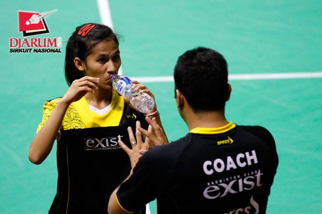 Priskila Siahaya (Exist) saat mendapatkan pengarahan dari pelatih.
