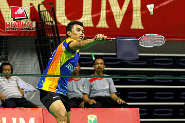 Eka Fajar (Jaya Raya) mengembalikan shuttlecock ke arah Panji Ahmad (Mutiara Bandung).